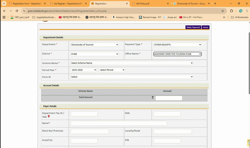 ₹50 चे चालान GRAS पोर्टलवर “Director of Tourism” या नावाने भरायचे आहे.