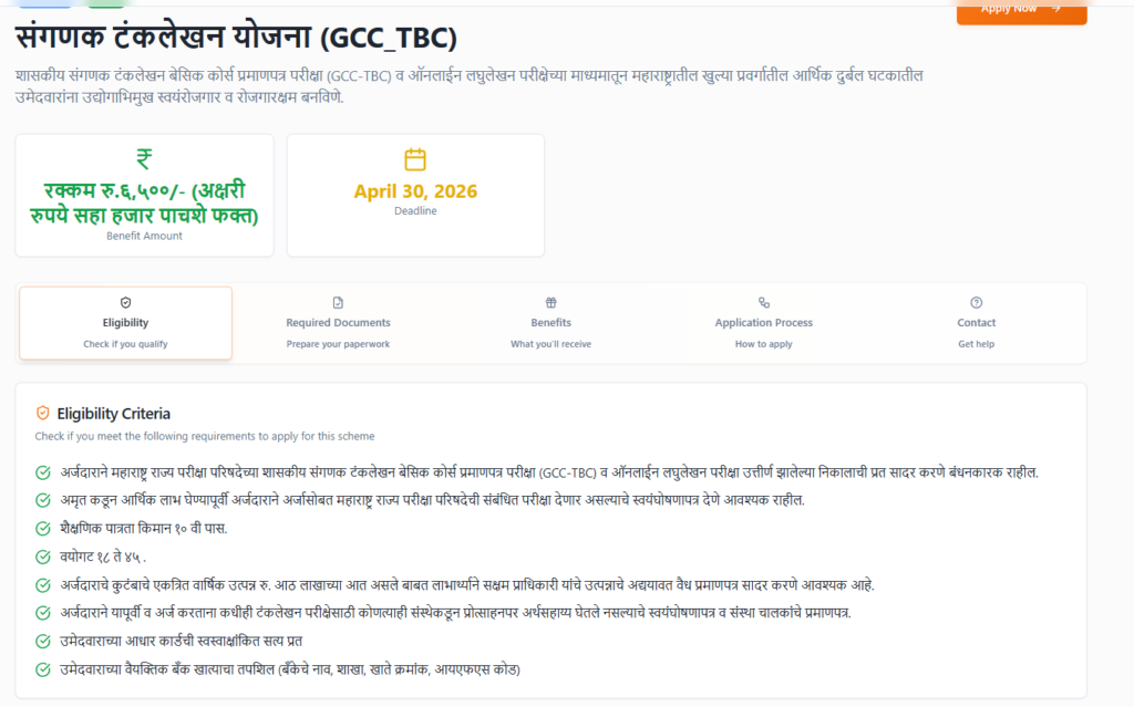 उत्तर: ही योजना प्रामुख्याने खुला प्रवर्ग (Open) आणि EWS प्रवर्गातील अशा विद्यार्थ्यांसाठी आहे, ज्यांनी टायपिंग परीक्षा (GCC-TBC) यशस्वीरीत्या उत्तीर्ण केली आहे.