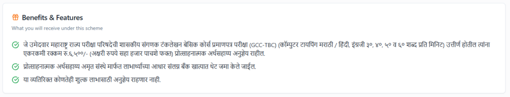 ज्या विद्यार्थ्यांनी टायपिंगची परीक्षा (मराठी/इंग्रजी/हिंदी) यशस्वीरीत्या उत्तीर्ण केली आहे, त्यांना शासन ₹6,500 चा एकवेळ (One-time) प्रोत्साहन भत्ता देते. ही रक्कम थेट विद्यार्थ्याच्या बँक खात्यात जमा केली जाते.