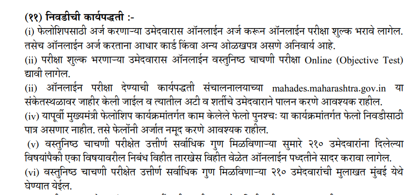 सध्या महाराष्ट्र शासनाने या फेलोशिपचा अधिकृत शासन निर्णय (GR) निर्गमित केला आहे. प्रत्यक्ष ऑनलाईन अर्ज प्रक्रिया लवकरच सुरू होईल. त्याची अपडेट तुम्हाला आमच्या वेबसाइटवर आणि यूट्यूब चॅनेलवर दिली जाईल.