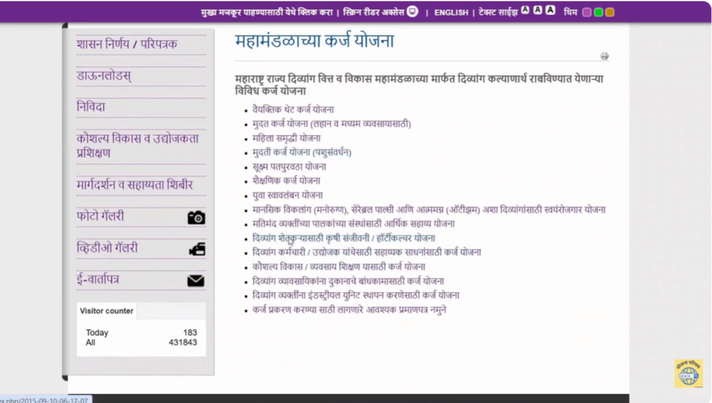 मित्रांनो, Divyang Scheme Maharashtra अंतर्गत महाराष्ट्र शासन आणि महाराष्ट्र राज्य दिव्यांग वित्त व विकास महामंडळ (MSHFDC) मार्फत दिव्यांग नागरिकांसाठी अनेक महत्वाच्या योजना राबवल्या जातात. या योजनांमध्ये कर्ज योजना, व्यवसायासाठी सहाय्य, शिक्षणासाठी कर्ज, महिला समृद्धी योजना, कृषी संजीवनी योजना, तसेच Shop on Vehicle सारख्या योजनांचा समावेश आहे.
