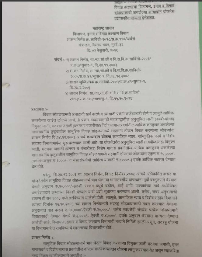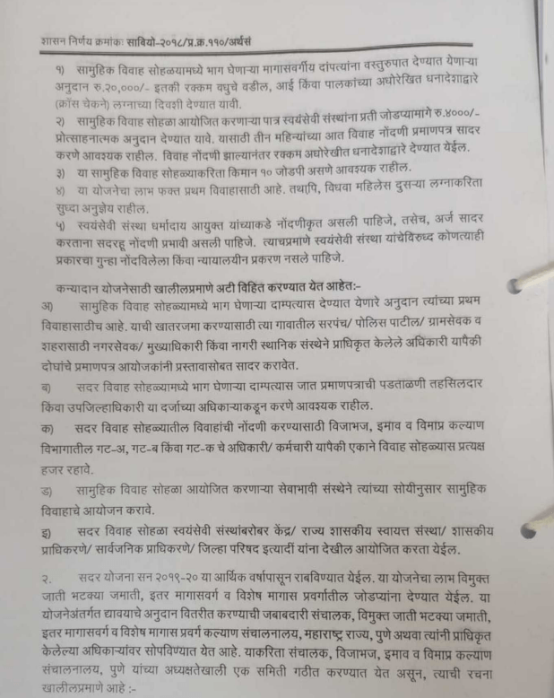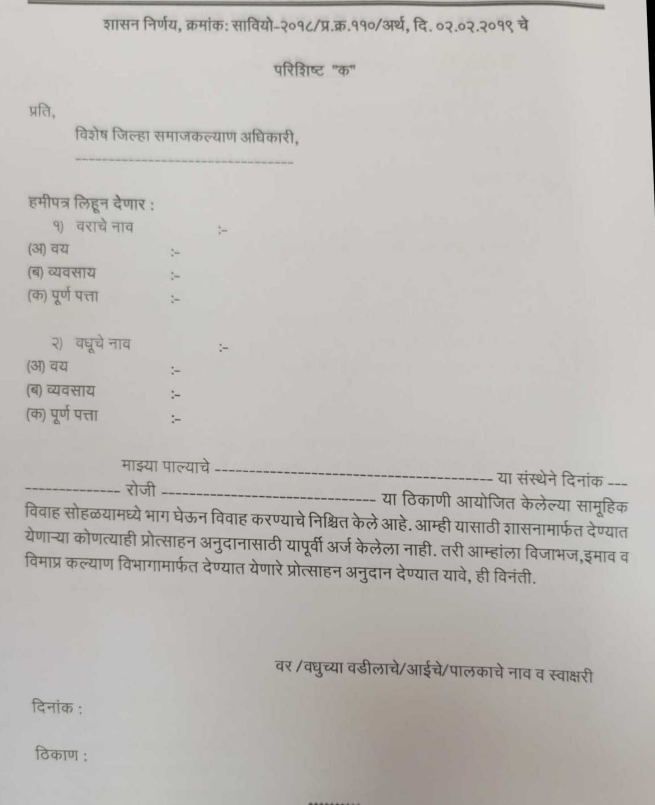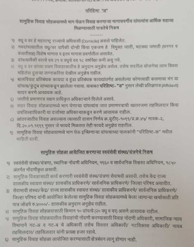ही योजना केवळ वैयक्तिक लग्नासाठी लागू नाही. लाभ मिळवण्यासाठी संबंधित जोडप्याने सामूहिक विवाह सोहळ्यामध्ये (Mass Marriage) लग्न करणे आवश्यक आहे. त्या सोहळ्यात किमान १० जोडप्यांचा सहभाग असणे शासनाने बंधनकारक केले आहे.