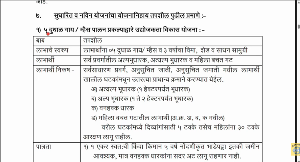 या प्रकल्पामध्ये लाभार्थ्यांना 5 दुधाळ गाई किंवा म्हशी दिल्या जाणार आहेत. यासोबतच जनावरांसाठी शेड बांधकाम आणि आवश्यक साधनसामुग्रीसाठी देखील आर्थिक मदत दिली जाणार आहे.